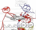 - Zombies & Shotguns, he gets sliced in half by chainsaw that Red was using.